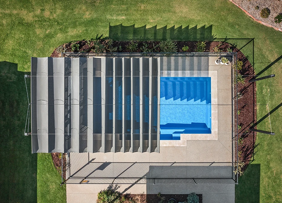 Having selected posts (columns) for ease of installation, the ShadeSpot™ engineers provided the plans for Glen to hire his home builder to install the columns. Their Windspray® floating sail cover most of their pool area (LxW) 10.6m x 4.85m. The structures were installed outside of the pool area/slab (900mm clearance from the pool fence for 'non-climbable zone'), so they preferred a floating sail (see 'how it all works' video).
