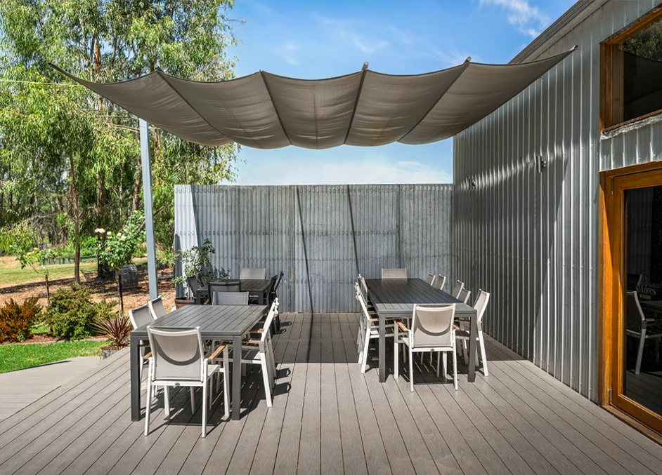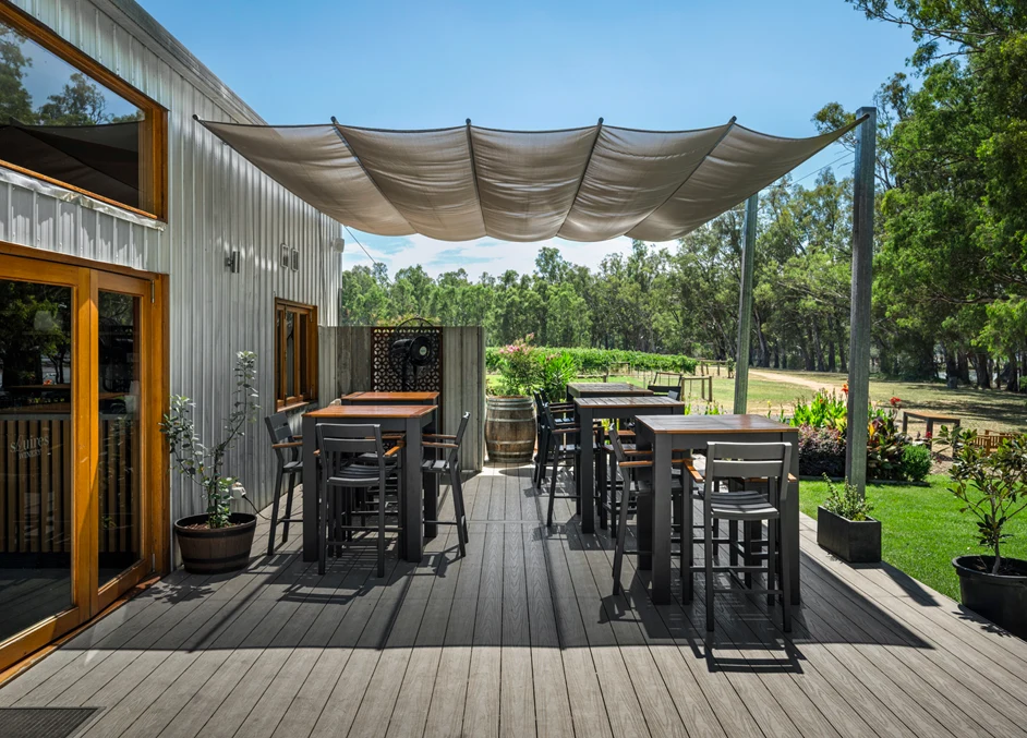 Squires Winery recently completed the construction of a large deck area at their stunning riverside venue. During summer, the deck was becoming unbearably hot. Tired of moving and repairing umbrellas, Paul was looking for a shade solution that would still allow him to take advantage of the sunshine during winter months.